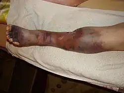Despite ongoing research, the cause of PTS is not entirely clear. Inflammation is thought to play a role[5][6] as well as damage to the venous valves from the thrombus itself. This valvular incompetence combined with persistent venous obstruction from thrombus increases the pressure in veins and capillaries. Venous hypertension induces a rupture of small superficial veins, subcutaneous hemorrhage[7] and an increase of tissue permeability. That is manifested by pain, swelling, discoloration, and even ulceration.[8]