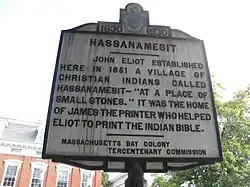 John Eliot was an English colonist and Puritan minister who played an important role in the establishment of praying towns. In the 1630s and 1640s, Eliot worked with bilingual indigenous Algonquians including John Sassamon, an orphan of the Smallpox pandemic of 1633, and Cockenoe, an enslaved Montauk prisoner of the Pequot War, to translate several Christian works, eventually including the Bible, into Massachusett.[2] Having learned quite a bit of Massachusett, Eliot began preaching and practicing evangelism among the Neponset band of Massachusetts, but was first well received when preaching at in 1646 at Nonantum in present day Newton, meaning "place of rejoicing" in Massachusett. The sermon led to a friendship with Waban (Nipmuc, c. 1604 – c. 1685), who became the first Native American in Massachusetts to convert to Christianity.[3]