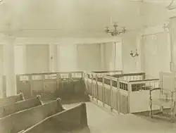 The colonial meeting house in America was typically the first public building built as new villages sprang up. A meeting-house had a dual purpose as a place of worship and for public discourse, but sometimes only for "...the service of God."[7] As the towns grew and the separation of church and state in the United States matured, the buildings that were used as the seat of local government were called town-houses[8] or town-halls.[9] Most communities in modern New England still have active meetinghouses, which are popular points of assembly for town meeting days and other events.
