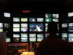 This is the production hub of the vehicle, and is where the majority of the production crew sit in front of a wall of video monitors. The video monitors show all the video feeds from various sources, including computer graphics, professional video cameras, video servers and slow-motion replay machines. The wall of monitors contains a preview monitor showing what could be the next source on air and a program monitor that shows the feed currently going to air or being recorded. The keyed dirty feed (with digital on-screen graphic) is what is actually transmitted back to the central studio that is controlling the outside broadcast.[13] A clean feed (without the graphics) could be sent to other vehicles for use in their production.[14] Behind the directors there is usually a desk with monitors where the assistant producers can work. It is essential that the directors and assistant producers are in communication with each other during events, so that replays and slow-motion shots can be selected and aired.