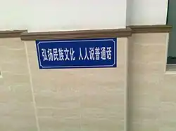 The promotion of Standard Chinese,[1] abbreviated as Tuipu (推普), is a campaign by the government of the People's Republic of China, with the stated goal being to facilitate easier communication throughout the country, which has historically spoken many mutually unintelligible varieties of Chinese, as well as non-Sinitic languages. Currently, the promotion of Standard Chinese is organized by the State Language Work Committee, a regulatory agency within the Chinese government.[2][3][4]