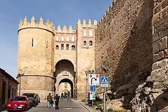 The gateway has also been known as the Puerta de la Judería[1] or the Puerta del Socorro,[2] and it is located on the south side of the walls of Segovia.[1] It has two towers, one square and one polygonal, an arch, a gallery of irregular windows, loopholes, cornices, pyramidal battlements and heraldic shields.[3] It is located in a strategic position overlooking the Río Clamores.[3] It has been speculated that its construction could have been carried out by the master stonemason Juan Guas.[4]