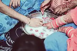 The newlyweds are welcomed in a ceremony called the pani bharna at the groom's house. Then the bride must, with her right foot, kick the sarson ka tel (mustard oil) that is put on the sides of the entrance door before she enters the house. Then, along with her husband, she must offer puja in their room. Then they must touch the feet of the elders in a ceremony called matha tekna. The rest of the evening is spent playing traditional games.[1]