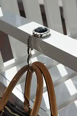 A purse hook (also known as a handbag hook or handbag hanger) is a type of hook meant to temporarily secure a purse or handbag to a table, sink or armrest. Such hooks have been available since the 1920s. Queen Elizabeth II was said to employ an oddly shaped one that looks like a soldier from World War II to hang her handbags on.[1]