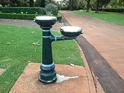 As well as sports fields, Queens Park was the home of municipal swimming baths from 1894 until 1964. The baths were first established on the south west corner of the park, near the corner of Margaret and Hume Streets. As much as for public recreation, the establishment of the baths located in this position seems to have been part of a strategy to drain this area of what was known as the East Swamp of Toowoomba. In 1937, with the popular national swimming movement this baths were enlarged and upgraded. The baths were removed in 1964 and replaced with the Vera Lacaze Memorial Park, an interesting example of modernist landscape architecture in Queensland.[1]