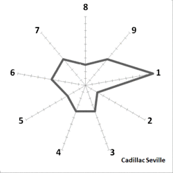 We can look at these plots individually or we can use them to identify clusters of cars with similar features. For example, we can look at the star plot of the Cadillac Seville (the last one on the image) and see that it is one of the most expensive cars, gets below average (but not among the worst) gas mileage, has an average repair record, and has average-to-above-average roominess and size. We can then compare the Cadillac models (the last three plots) with the AMC models (the first three plots). This comparison shows distinct patterns. The AMC models tend to be inexpensive, have below average gas mileage, and are small in both height and weight and in roominess. The Cadillac models are expensive, have poor gas mileage, and are large in both size and roominess.[5]