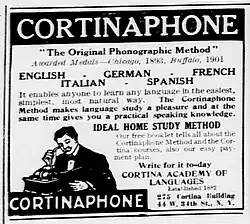 In 1908, he registered the trademark of Cortinaphone, selling own brand of phonograph, and since 1913 his company started to issue flat round recordings.[102] The Cortina school kept using English for instruction until 1920, when they switched to target language only.[103] Around 1920 he was marketing "Cortina phonograph outfit", advertised as more efficient than teaching by instructors.[104]