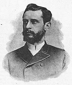 There is no information on political preferences of the Díez de la Cortina until the mid-19th century;[31] in the 1860s various members of the family, including José Díez de la Cortina Cerrato, his wife and sons, started to appear as signatories of various open letters printed in Neo-Catholic and Traditionalist papers; they pledged loyalty to the Catholic Church and lambasted "corrupción de las ideas y de costumbres", especially in education.[32] Later his son recollected that it was the 1868 revolution and its aftermath which triggered Díez de la Cortina Cerrato's access to Carlism;[33] in 1870 he already declared his "completa adhesión al señor Duque de Madrid".[34] When the Carlist insurgency rocked Vasco-Navarrese provinces in 1872 he pondered upon joining the rebels, the idea which soon became his obsession.[35] In June 1873 the 17-year-old Rafael's brother José was dispatched North to agree the logistics and learn the war craft.[36]