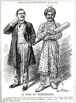 These performances brought him into contention for a place in the England team for the first Test match, but although his form merited selection, he was not chosen by the MCC committee which chose the team. Lord Harris was primarily responsible for the decision, possibly under influence from the British Government; Simon Wilde believed they may have feared establishing a precedent that made races interchangeable or wished to curtail the involvement of Indians in British political life.[92] Bateman's assessment is less sympathetic to Harris: "the high-minded imperialist Lord Harris, who had just returned from a spell of colonial duty in India, opposed his qualification for England on the grounds of race".[93]