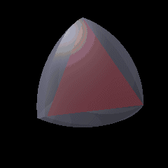 The Reuleaux tetrahedron is the intersection of four balls of radius s centered at the vertices of a regular tetrahedron with side length s.[1] The spherical surface of the ball centered on each vertex passes through the other three vertices, which also form vertices of the Reuleaux tetrahedron. Thus the center of each ball is on the surfaces of the other three balls. The Reuleaux tetrahedron has the same face structure as a regular tetrahedron, but with curved faces: four vertices, and four curved faces, connected by six circular-arc edges.