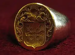 An emblematic ring, often bearing a family coat of arms, some of which are fit for use to imprint a wax seal. In the event a seal or at least a representation of a seal is on the ring, it is called a "seal ring". The signet may bear anything from a custom-designed escutcheon to simple initials, in which case it is known as an initial ring.