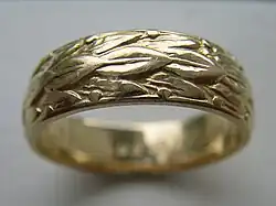 Rings have been found in tombs in Ur dating back to circa 2500 BC.[3] The Hittite civilization produced rings, including signet rings, only a few of which have been discovered.[4] People in Old Kingdom Egypt wore a variety of rings, of which a few examples have been found, including the famous scarab design.[4] Rings became more common during the Egyptian Middle Kingdom, containing increasingly complex designs.[4] Egyptians made not only metal rings but rings from faience, some of which were used as new year gifts.[5] Native styles were superseded by Greek and Roman fashions during the Ptolemaic dynasty.[4]