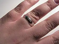 The fourth digit or ring finger of the left hand has become the customary place to wear betrothal, engagement and wedding rings in much of the world, though in certain countries the right hand finger is used.[14] This custom was practically established as norm during World War II.[15]