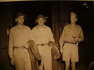 (L-R) Cdr. W.R. Specht, Commodore Edward 'Mike' Moran, and LCdr. R.B. Kelly at Rendova, May 1944 | |