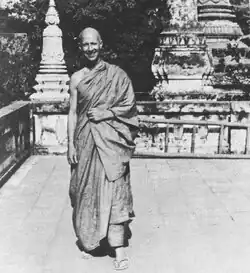 Cambodia's Buddhist elite before Balzer's (left) ordination. He is speaking to the Samdech Dhammalikket (right; *?1873, of Wat Langka, វត្តលង្ការ), seated between are his preceptor Bhante Dharmawara (1889-1999; 2nd from right) next to him in the corner is: Indanano Phul Tés (1891–1966).