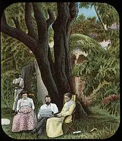![]() Robert Moffat sitting under an almond tree at Kuruman with Mary Moffat and their eldest daughter Mary |