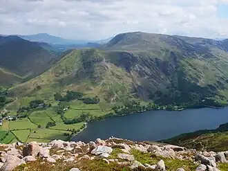 The western flanks of the fell fall to Buttermere, the village itself standing on Robinson's territory. The top and bottom sections are quite steep but the slope levels out at 1,500 feet (460 m) to accommodate Buttermere Moss, in Wainwright's words “ a wide marshy depression from which water cannot escape except by being carried away in the boots of pedestrians.”[1] At the head of the lower slope is the subsidiary top of High Snockrigg (1,725 feet; 526 m), a fine viewpoint for the Buttermere valley. On the south western rim of the Moss is Goat Crag, overlooking Buttermere lake.