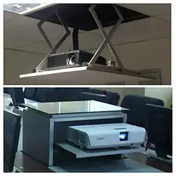 Top: A projector on a lift table so that it can be raised in and out of the ceiling. Bottom: A projector on a roll-out shelf beneath a table.