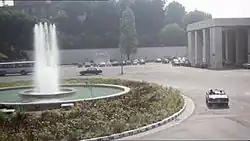 The square outside of the station was named Piazzale dei Partigiani after World War II.[2] Now, the square's primary function is a bus terminal and parking facility. Before 1990, however, the piazza was embellished with a well-maintained garden and a now-nonfunctioning fountain that was built in the 1950s as part of the design of the station's architect Roberto Narducci. The fountain was inexplicably excluded from the modernization and renovations for the 1990 World Cup, even though the square was part of the ambitious "Cento Piazze" beautification project.[6] The small palm gardens that surround the parking lot are today occupied by a number of homeless people, asylum seekers, and political refugees.[7] Every Monday and Friday, Red Cross volunteers use the square to distribute food to the city's homeless population, despite protests from the area's residents who say that the organization arbitrarily selected the site.[8]