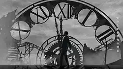 After that, Tokito turns around to see the giant clock pointing to 11:58 in the background, which is the time that the Great Kantō earthquake occurred. Suddenly, he runs across the showy background and throws a letter into the door being close. Later, he walks crestfallenly, showing the black lyrics on white background. The door opened to show the letter is sent to Chiyoko. She read it and run to throw her reply letter sent to him. He reads the letter while standing on the hour hand of a clock and meet Chiyoko, which stands on the minute hand. Finally, the pair runs towards each other and embraces, but as quickly, the music video ended up with Chiyoko fading from an explosion of light.[23]