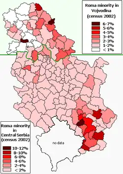 Romani people, or Roma, are a recognized ethnic minority in Serbia.[2] According to data from the 2022 census, they are the fourth largest ethnic group in the country, numbering 131,936 and constituting 2% of the total population.[1] However, owing to various factors, the census figure likely underrepresents the actual population.[3][4]
