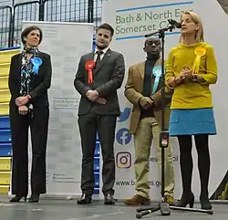 In similar fashion, candidates wearing suits to their election counts will often wear a tie of their party's corresponding colour. Coloured flowers are also sometimes used, particularly in the case of the red rose as a symbol of the Labour Party; this has been common since the 1980s when leaders Neil Kinnock and Tony Blair encouraged their use, and Labour adopted the red rose as the party's logo.[3][4]
