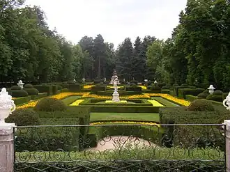 Extending over 1,500 acres (6.1 km2), the gardens around the palace are one of the best examples of 18th-century European garden design in the Jardin à la française style in Spain.[7] The French designer from the official French royal offices of Robert de Cotte was René Carlier,[8] who used the natural slope of the site in the palace grounds design, for enhancing axial visual perspectives, and to provide sufficient head for water to shoot out/up from the twenty-six sculptural fountains in the formal gardens and landscape park.
