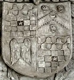 Detail of Chichester escutcheon, Ruxford. Armorials quarters 1&4: Chequy or and gules, a chief vair a mullet for difference (Chichester); 2: Argent, a chevron engrailed gules between three lion's faces azure a crescent for difference (Copleston of Eggesford); 3: Gules, a pair of wings conjoined ermine (de Reigny of Eggesford)