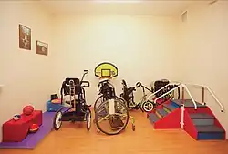 The station is designed for round-the-clock care for 20 patients and, in addition, for 10 patients from the daycare station. The length of stay depends on individual needs of a child and his family. The purpose of the care station is to stabilize and possibly improve the child's state of health, as well as to provide respite care for the family. The care station provides the children with all necessary medical and psychological rehabilitation opportunities. The interior of the entire inpatient facility is different from public children's hospitals. There are no wards with white walls. Instead, there are rooms decorated with drawings for children living together with their mothers. All the furnishings inside the hospice facility are designed to improve the child's emotional state.