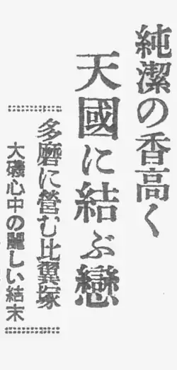The headline The fragrance of purity is high, and love tied to heaven written by Tokyo Nichi Nichi Shimbun became the talk of the masses who believed the incident was platonic love. Shochiku's film department released a film on June 10 titled Love Tied to Heaven.