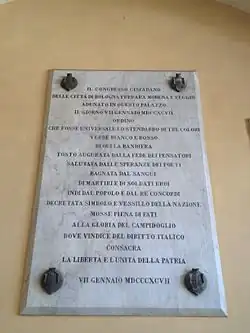Moreover, in Reggio Emilia, in August 1796, one of the first liberty pole had been planted.[8] This event, which arose from a revolt against the ducal government on 20 August 1796 in Reggio, contributed, together with the events linked to the battle of Montechiarugolo, to the decision to choose Reggio Emilia as the venue for the cispadane congress, the assembly that then led to the birth of the flag of Italy.[8]