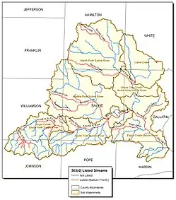 The Saline River is a tributary of the Ohio River, approximately 27 miles (43 km) long,[3] in the Southern Illinois region of the U.S. state of Illinois. The river drains a large section of southeast Illinois, with a drainage basin of 1,762 square miles (4,564 km2). The major tributaries include the South Fork, Middle Fork and North Fork, all lying within the Saline Valley. The once meandering swampy river was important among Native Americans and early settlers as a source of salt from numerous salt springs where it was commercially extracted in the early 19th century.