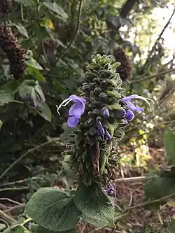 Salvia macrostachya is a rare herb native to Ecuador and southern Colombia, with no specific information about its native habitat. A woody, clump-forming plant, it grows up to 4 metres (13 ft) high on thick stems, with broadly ovate leaves that are approximately 8 to 12 cm (3.1 to 4.7 in) long and wide. The inflorescence is of very dense terminal racemes that are 10 to 30 cm (3.9 to 11.8 in) long. The blue corolla is approximately 2.5 cm (0.98 in) in long.[1]