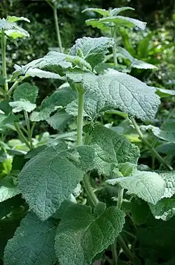 Salvia przewalskii forms a basal clump of yellow-green leaves 1 to 2 feet (30 to 61 cm) high and wide, with flowering stalks rising 3 feet (91.4 cm) above the plant. The 6-12 inch (15 to 30 cm) leaves, with long petioles, have distinct veins on the underside. The inflorescence is branched, with widely spaced whorls of flowers opening a few at once. The 1 inch (2.54 cm) flowers are fat, with an unusual purple-red or red-brown color. The calyx is hairy and glandular, red-brown and two-lipped. It is usually seen only in botanical gardens, though seeds have become available for gardeners since the 1980s.[1] Botanists have segregated the species into four varieties, distinguished by leaf shape and differences in the hairs covering the foliage.
