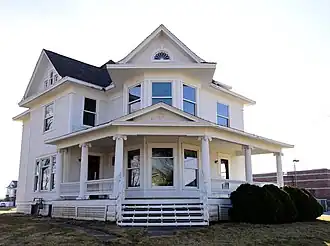 The Samuel and Emma A. Ranshaw House is a historic building in North Liberty, Iowa, United States. At the time this house was built in 1908, North Liberty was a small and prosperous farming community.[2] The Ranshaws engaged Iowa City architect-builder Bernard Wickham to design and construct this transitional Free Classic subtype of the Queen Anne style. It is characterized by simple classical decorative details that were becoming popular in the early 20th-century, as opposed to the more elaborate elements of the Late Victorian style. It was a typical house that Wickham was building in this area.[2] The 10-acre (4.0 ha) farmstead on which it was built was surrounded by farm fields just to the west of the town. Suburban development now surrounds the house on its 2-acre (0.81 ha) lot. In addition to the house, a concrete sidewalk and cistern cap with inlaid glass marbles that are set in geometric and floral patterns is included in the nomination. They were listed on the National Register of Historic Places in 2012.[1]