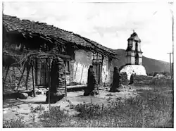 Pala Asistencia, with its original bell tower, circa 1875. The structure is loosely styled after a similar one at the Mission of Nuestra Señora de Guadalupe located in Juárez, Mexico.[10]