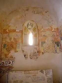 The hermitage housed many fine Romanesque frescoes from about 1125; most of these have been removed, but some have remained. Two sections, transferred to canvas, are now in the Indianapolis Museum of Art, showing the Entry of Christ into Jerusalem and the Wedding at Cana.[7] Other sections, including The Healing of the Blind Man and the Raising of Lazarus and The Temptation of Christ are in the Metropolitan Museum of Art in New York,[8] and in the Prado. The paintings are considered the work of three anonymous local artists. All decorative motifs on arches and vaults, as well as the large biblical scenes and the paintings on the apse, are attributed to the Master of Maderuelos, or First Master of Casillas. The hunting scenes of the lower areas, which are the most original, are attributed to the Master of San Baudelio. A third master of more modest proficiency is considered the author of the paintings inside the choir. [The paintings were done by the Catalan Master of Tahull (Taüll in Catalan), whose best known works are in Sant Climent de Taüll and the Museu Nacional d'Art de Catalunya in Barcelona,[9] with two other painters.]? The scenes of the Life of Christ are unusual in Spanish painting at this period; these are in American museums, while smaller elements including scenes of hunting and falconry and decorative copies of textiles are in Madrid as well as New York.[10] The frescoes include that of a camel and of a war elephant, which were inspired by Muslim motifs.[1]