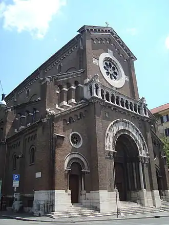 The façade, by Passarelli, is in the Neo-Gothic style of Lombardy. It is covered with red stone, with decorative elements in travertine. Before it is a large staircase. There are three doorways, each with a lunette with bas-relief above. Over the central one is Christ presenting Saint Camillus to the Sick, to the sides are Christ between Children and The Pardon of the Adulteress. Between the two stories is a gallery decorated with symbols of the Evangelists.[1]