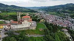 The medieval church at this site was initially built within the protection of a castle. It was rebuilt over the centuries, including a consecration in 1525. The present church and bell-tower were completed between 1808 and 1812. The layout is that of a Greek cross with a single nave. The main altarpiece depicts an Enthroned Madonna and Child between Saints Anthony of Padua and John the Evangelist (1486) by Bartolomeo Montagna. A lightning bolt damaged the church, collapsing the bell-tower. The damage has subsequently been repaired.[1]