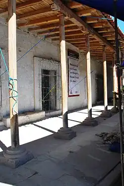 The town has two churches, one dedicated to Saint John the Apostle and the other dedicated to Saint Paul.[1] When the Spanish arrived in the 1520s, nothing rivaled pre-Hispanic Mitla as a religious center in the Oaxaca Valley. In 1544, the church of San Pablo was established on part of the ruins of the old Zapotec religious complex. The church sits on a pre-Hispanic platform which now functions as the atrium.[5] Access to the church is through a portal decorated with pyramid-shaped crests and a niche.[1] The church is 39 meters long and twelve wide, with three naves enclosed by lanterned octagonal domes. The vaults were constructed later, perhaps in the 19th century. The squared apse is closed with a circular dome and cupola is not as high as the nave and is likely from the 16th century. Behind it is a larger octagonal dome that encloses the sanctuary, with one other dome enclosing the choir. The wall of the south atrium was originally part of a pre-Hispanic structure and still contains the mosaic fretwork which defines the Zapotec site.[5] The interior of the church is notable for a large number of 16th-century and other colonial-era santos (statues of the saints), many of them done in well-preserved polychrome.[6]
