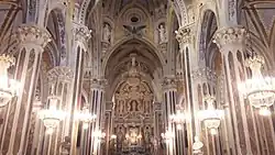 The high altar, realized in baroque style in 1627, is embellished by polychrome marbles; in the marble complex of the presbytery there is a statue of the Immaculate Conception, dating back to the first half of the 17th century, and the wooden statues of Saint Albert and Saint Julian, patrons of Erice, on the two sides.[1]