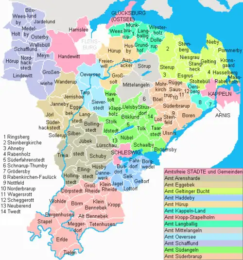 The district was established in 1974 by merging the former districts of Flensburg-Land and Schleswig. Due to the proximity of Denmark and the regional history there is a large percentage of Danish inhabitants.