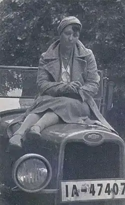 Lisa Matthias sitting on her car