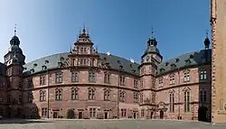 Schloss Johannisburg (German pronunciation: [ˈʃlɔs joˈhanɪsbʊʁk]) is a schloss in the town of Aschaffenburg, in Franconia, in the state of Bavaria, Germany. It was erected between 1605 and 1614 by the architect Georg Ridinger for Johann Schweikhard von Kronberg, Prince Bishop of Mainz. Until 1803, it was the second residence of the Archbishop and Prince Elector of Mainz. It is constructed of red sandstone, the typical building material of the Spessart, the hills near Aschaffenburg.