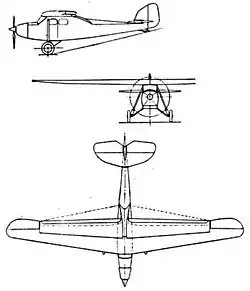 Its landing gear was of the fixed, conventional tailwheel type. Each mainwheel was mounted on a faired-in pair of V-strut pairs with a tall, inward leaning shock absorber strut from the axle to the wing root.[3][7] Later on this was replaced by a vertical shock absorber strut to the wing underside.[8] At the rear the tailskid was vertically sprung.[3][7]