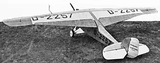 Flown by Wolf Hirth, the SN.2 flew for the first time on 12 January 1932 from Breslau.[7] By March tests showed that opening the wing fully shortened take-off distance by a factor of two.[9] In May it flew to Berlin[10] where it was demonstrated in flight at Tempelhof.[6] It was on static display at the DELA exhibition of sports aircraft held in Berlin for most of October 1932, registered as D-2257.[11] It remained in action until at least 1934, when it moved to the new, all letter, civil registration scheme as D-YRON.[12]