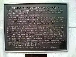 During World War I, the university allowed the U.S. military to use the university's grounds for testing. In 1917, the U.S. military divided American University into two segments: Camp Leach and Camp American University. Camp Leach was home to advanced research, development, and testing of modern camouflage techniques. Camp American University was an experiment station that became the birthplace of the United States' chemical weapons program and the site of chemical weapons testing.[11][12] A major cleanup effort began in the 1990s to remove chemical weapon remnants, particularly a cache of over 200 mustard-gas shells buried beneath the campus.[13] Additional material was located in June 2024.[14][15]