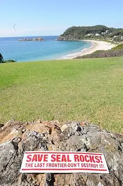 Seal Rocks is well known for its peaceful resistance to attempts by developers to commercialise the small picturesque fishing village. On entering the town by the road, the slogan "Save Seal Rocks The Last Frontier" can be seen painted on the road itself, this has been continually repainted for over 30 years. Currently the local council is making an attempt to commercialise the small caravan park, and a movement is once again growing against this.[9]