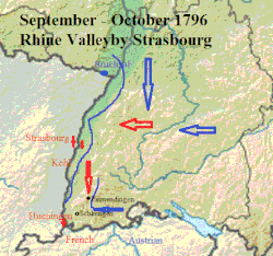 On the French side, the 80,000-man Army of Sambre-et-Meuse held the west bank of the Rhine down to the Nahe and then southwest to Sankt Wendel. On the army's left flank, Jean Baptiste Kléber had 22,000 troops in an entrenched camp at Düsseldorf. The right wing of the Army of the Rhine and Moselle was positioned behind the Rhine from Hüningen northward, centered along the Queich River near Landau, and its left wing extended west toward Saarbrücken.[3] Pierre Marie Barthélemy Ferino led Moreau's right wing at Hüningen, Louis Desaix commanded the center and Laurent Gouvion Saint-Cyr directed the left wing. Ferino's wing consisted of three infantry and cavalry divisions under François Antoine Louis Bourcier and Henri François Delaborde. Desaix's command included three divisions led by Michel de Beaupuy, Antoine Guillaume Delmas and Charles Antoine Xaintrailles. Saint-Cyr's wing had two divisions commanded by Guillaume Philibert Duhesme and Alexandre Camille Taponier.[5]