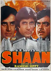 Shaan (translation: Grandeur) is a 1980 Indian Hindi-language action crime film directed by Ramesh Sippy and produced by G. P. Sippy under the production banner of Sippy Films with a story written by Salim–Javed after the blockbuster success of Sholay (1975).